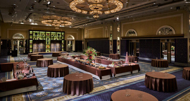最大収容人数:700名天井高6m、最大500名収容の圧倒的なスケールと開放感、美麗なシャンデリアとインテリアから漂うエレガント空間